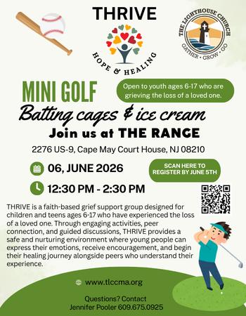 Join us for a fun and meaningful THRIVE Day at The Range! Children and youth are invited to enjoy an afternoon of mini golf, batting cages, and ice cream while connecting with others who understand the journey of grief. THRIVE is a faith-based program designed to support children and youth who are navigating the loss of a loved one, offering a safe place to build friendships, find encouragement, and experience hope. We’d love for you to come be part of this special day of laughter, connection, and care. Register HERE.
